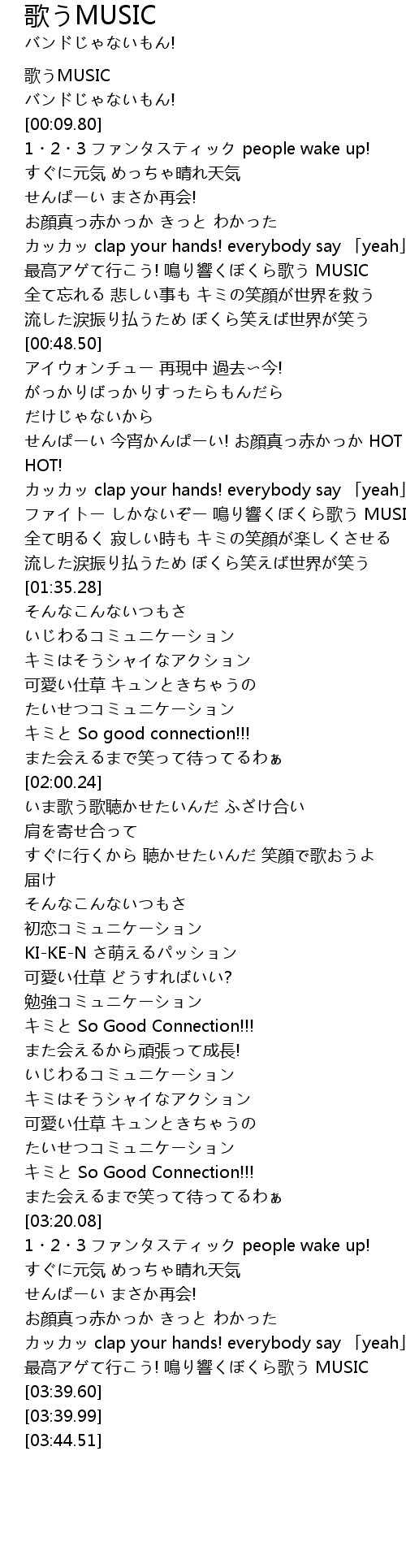 | [03:33.24] | 最高アゲて行こう! 鳴り響くぼくら歌う MUSIC |
