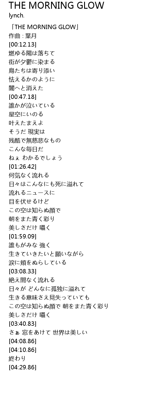 | [00:00.13] | 「THE MORNING GLOW」 |
