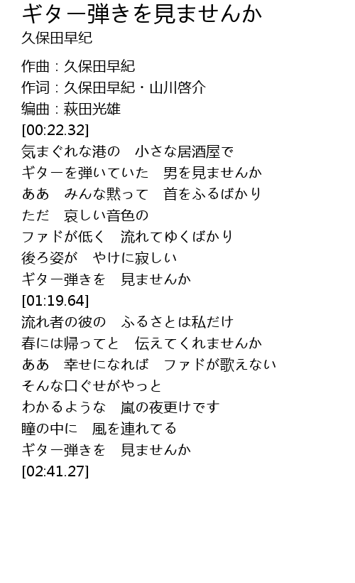 | [00:30.21] | ギターを弾いていた 男を見ませんか |