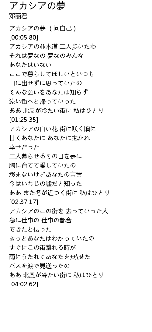 | [03:02.93] | アカシアのこの街を 去っていった人 |