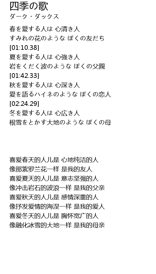 | [00:50.58] | 喜爱春天的人儿是 心地纯洁的人 |
