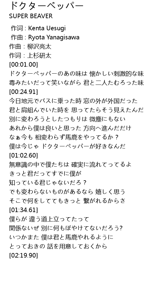 | [00:56.85] | 僕は今じゃ ドクターペッパーが好きなんだ |