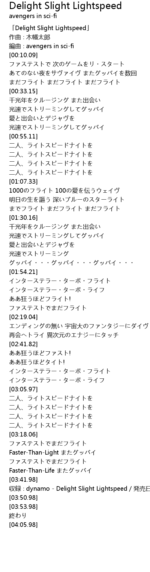 | [03:47.98] | 収録∶dynamo - Delight Slight Lightspeed/発売日∶2010/10/20 |