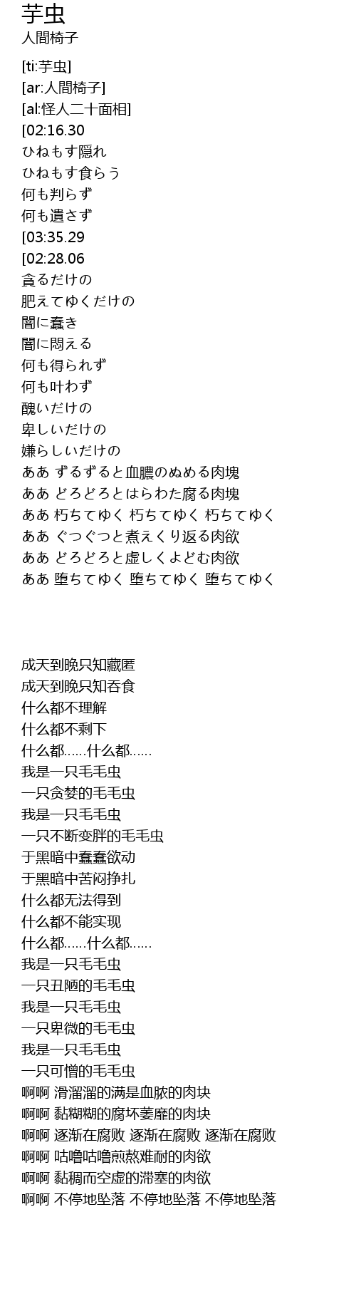 | [02:16.80][02:28.06][03:47.39][03:58.66][04:09.91] | 俺は芋虫 |
