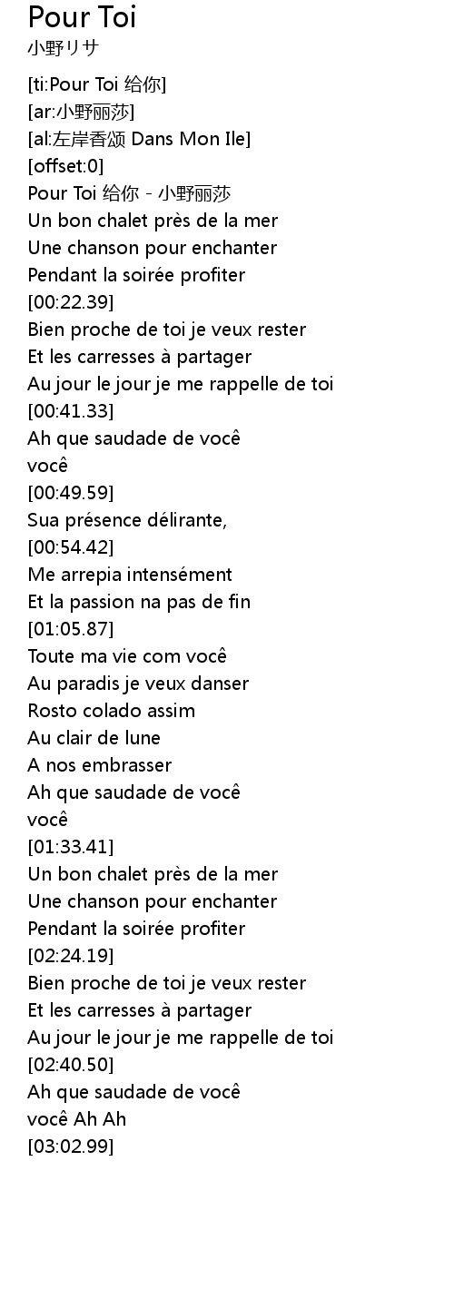 | [00:01.51] | Pour Toi 给你 - 小野丽莎 |