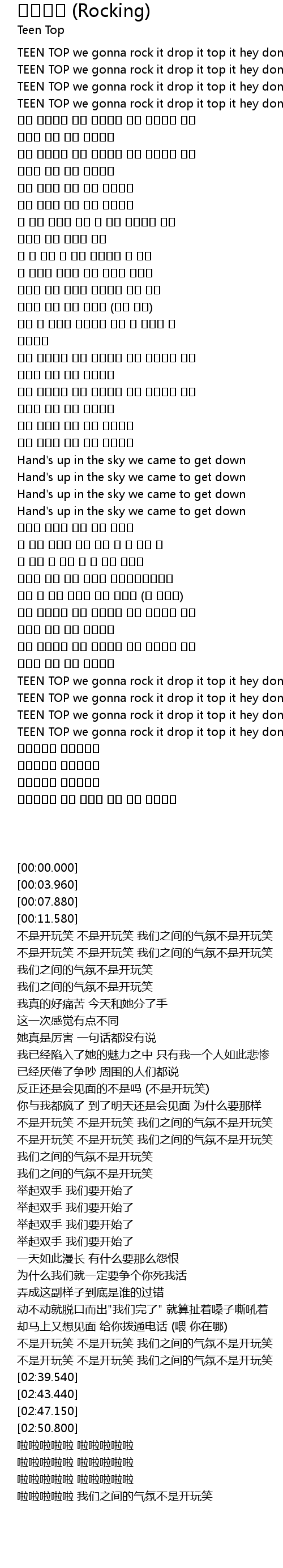 | [02:39.540] | TEEN TOP we gonna rock it drop it top it hey don't stop it pop it |