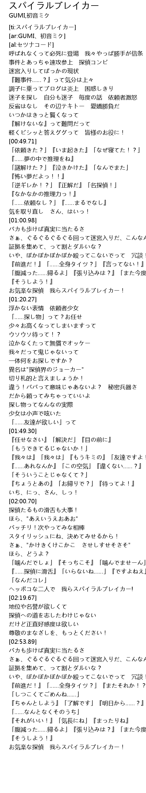 | [01:16.88] | お気楽な探偵 我らスパイラルブレイカー! |