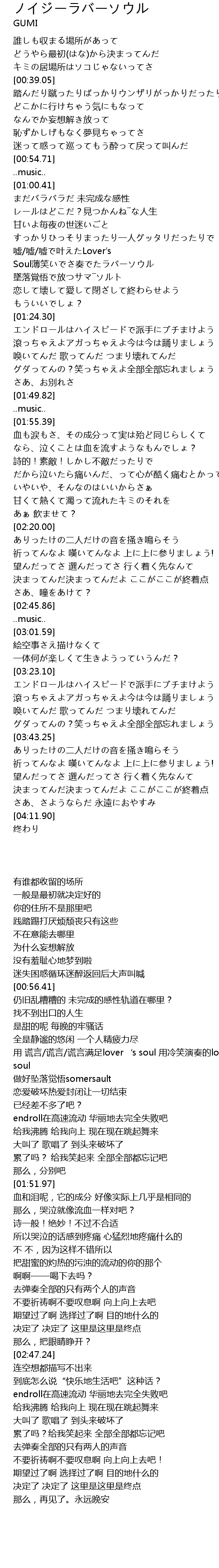 | [01:12.18] | 用 谎言/谎言/谎言满足lover‘s soul 用冷笑演奏的lover soul |