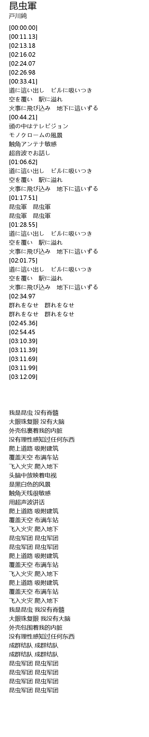 | [02:48.98][02:54.45][02:59.98][03:05.63] | 昆虫軍 昆虫軍 |