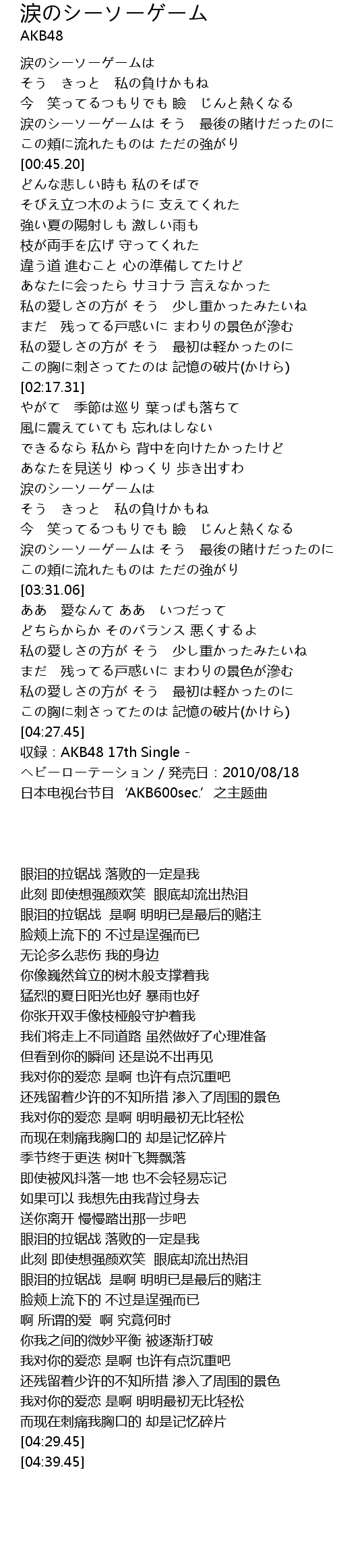| [04:29.45] | shou lu: AKB48 17th Single fa mai ri: 2010 08 18 |