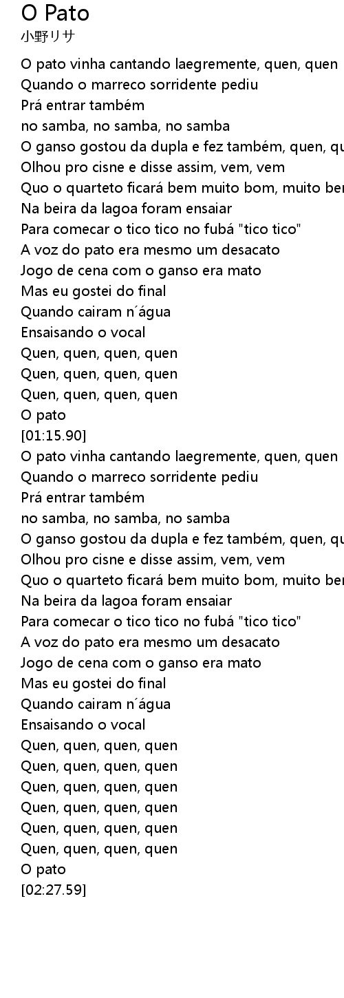 | [00:21.75] | O pato vinha cantando laegremente, quen, quen |