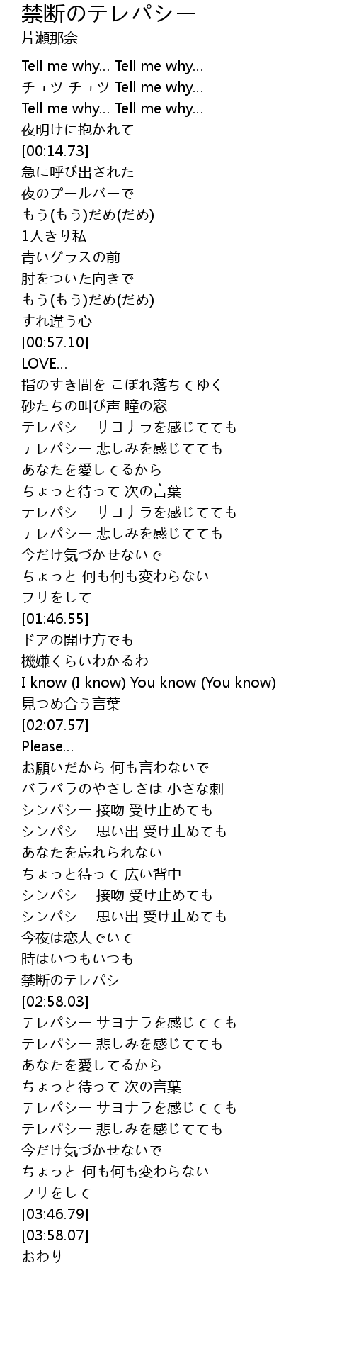 | [01:13.41] | テレパシー サヨナラを感じてても |