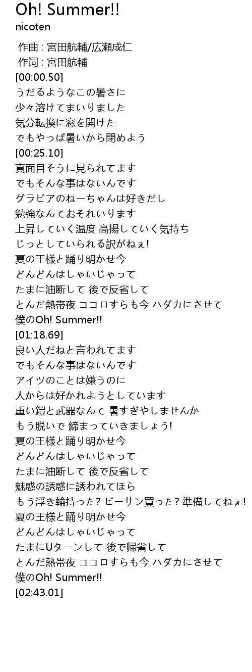 | [02:12.93] | もう浮き輪持った? ビーサン買った? 準備してねぇ! |