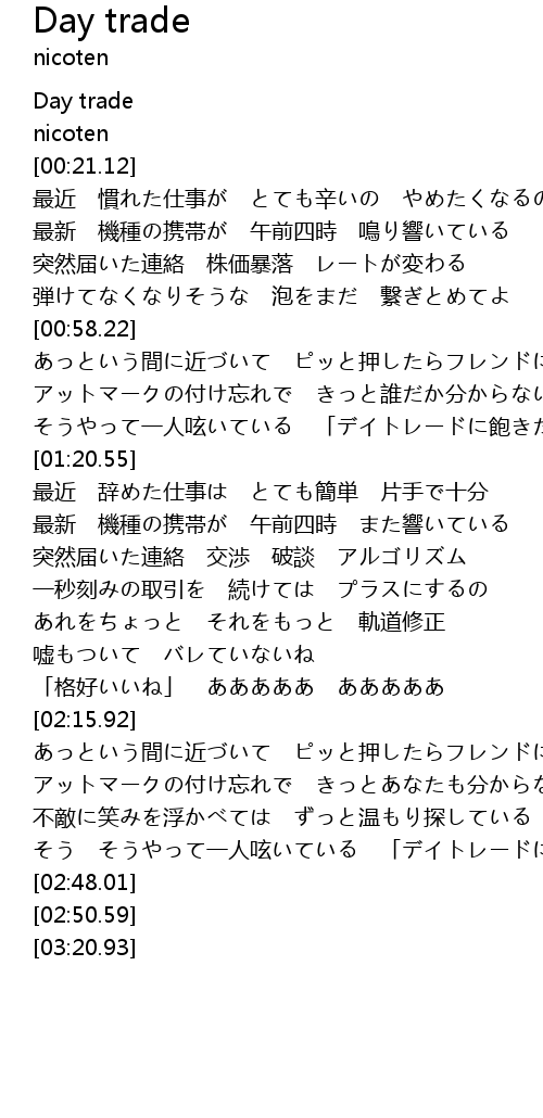 | [01:13.06] | そうやって一人呟いている 「デイトレードに飽きただけ」 |