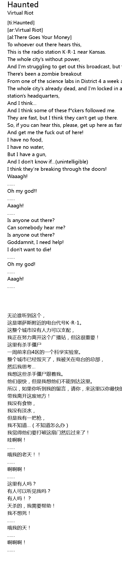 | [00:23.22] | The whole city' s already dead, and I' m locked in at the radio station' s headquarters, |