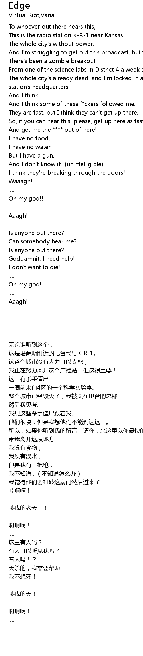 | [00:23.22] | The whole city' s already dead, and I' m locked in at the radio station' s headquarters, |