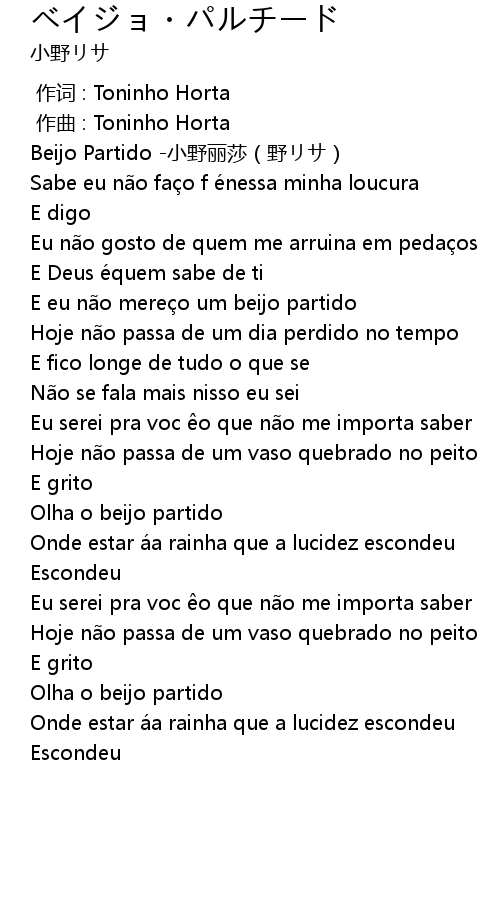 | [00:00.00] | Beijo Partido -小野丽莎(野リサ) |
