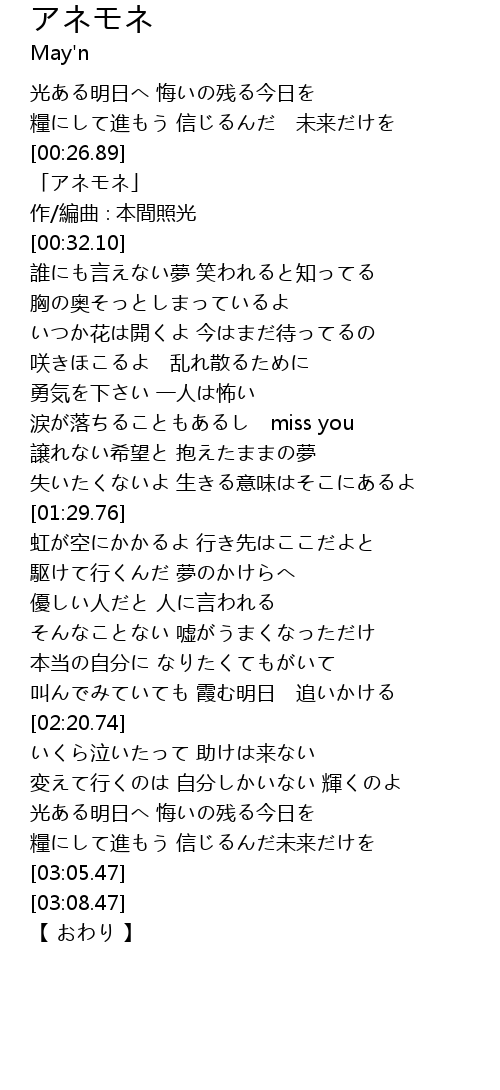 | [00:03.03] | 光ある明日へ 悔いの残る今日を |