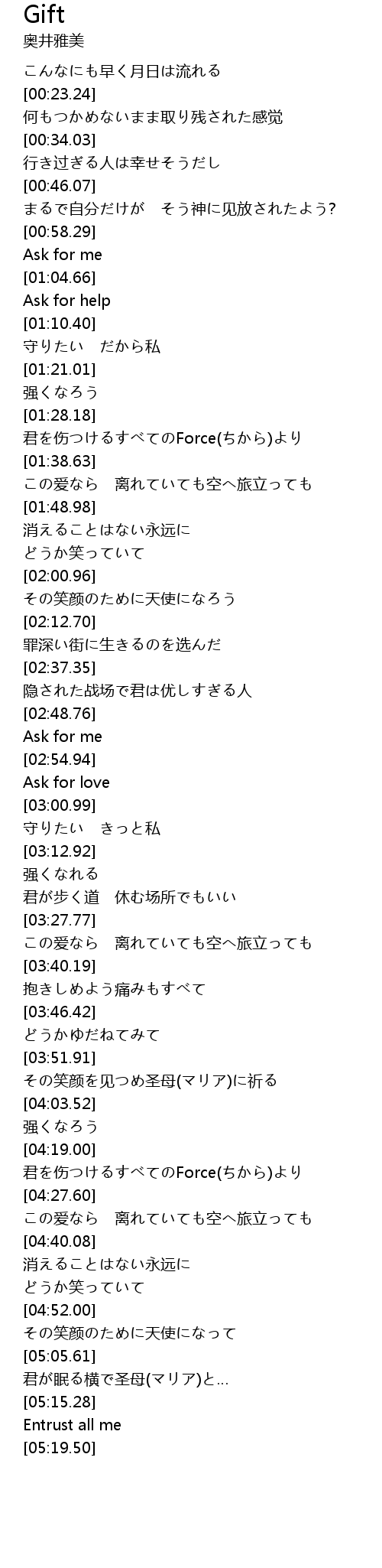 | [03:55.47] | その笑颜を见つめ圣母(マリア)に祈る |