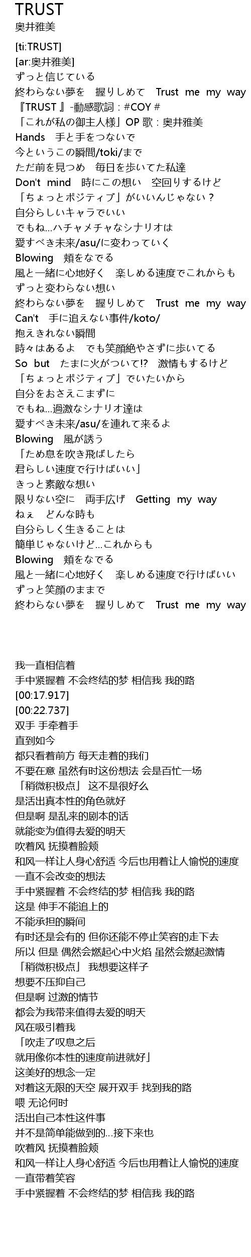 | [00:17.917] | TRUST dòng gǎn gē cí: COY |