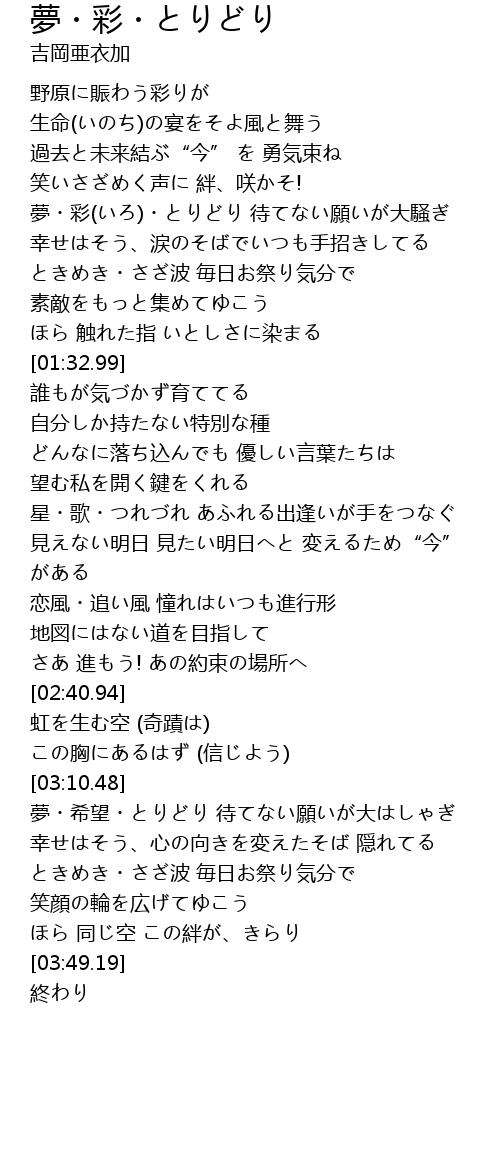 | [00:55.58] | 夢・彩(いろ)・とりどり 待てない願いが大騒ぎ |