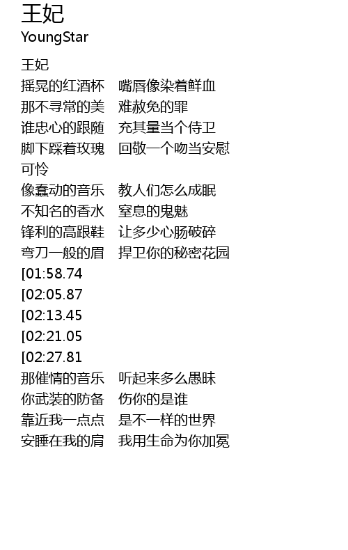 | [03:14.93][02:27.81][01:31.37] | wǒ de wáng fēi wǒ yào bà zhàn nǐ de měi |
