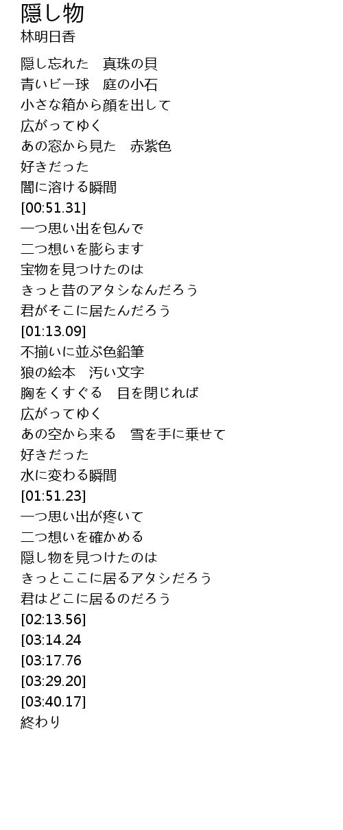 | [03:25.09][03:17.76][03:10.34][03:02.99][02:55.62][02:48.30] | 隠し物から 証になる |