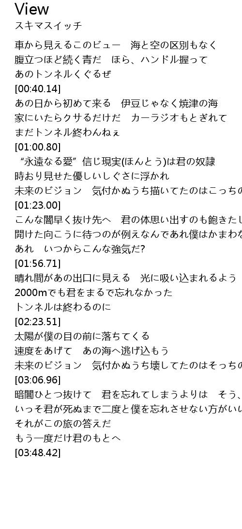 | [00:25.16] | 車から見えるこのビュー 海と空の区別もなく |