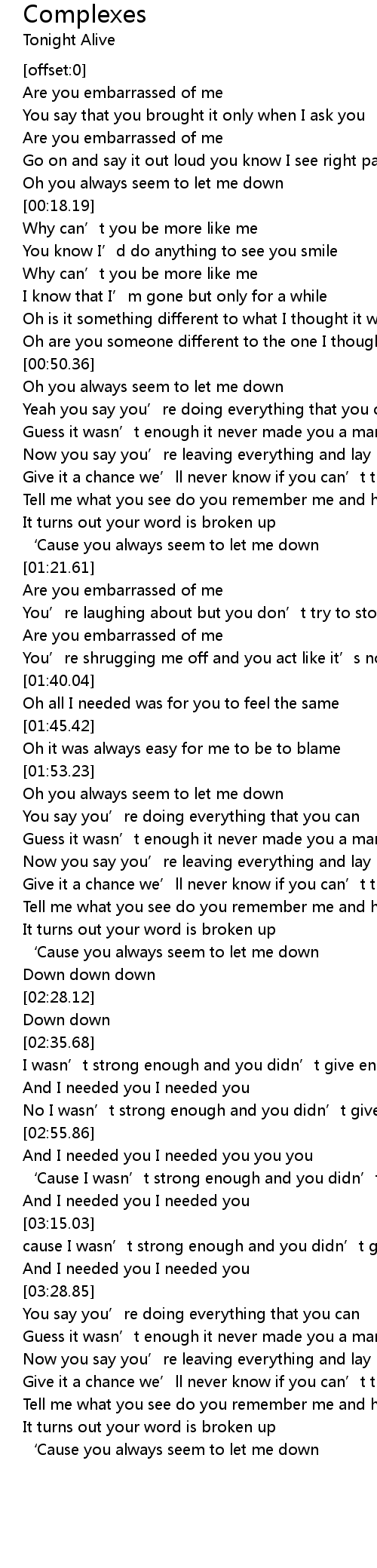 | [01:18.04] | ‘Cause you always seem to let me down |