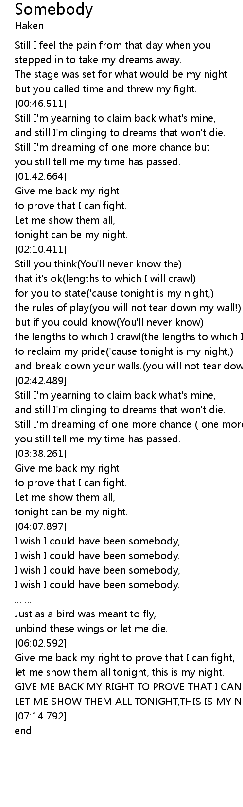 | [06:46.969] | GIVE ME BACK MY RIGHT TO PROVE THAT I CAN FIGHT, |
