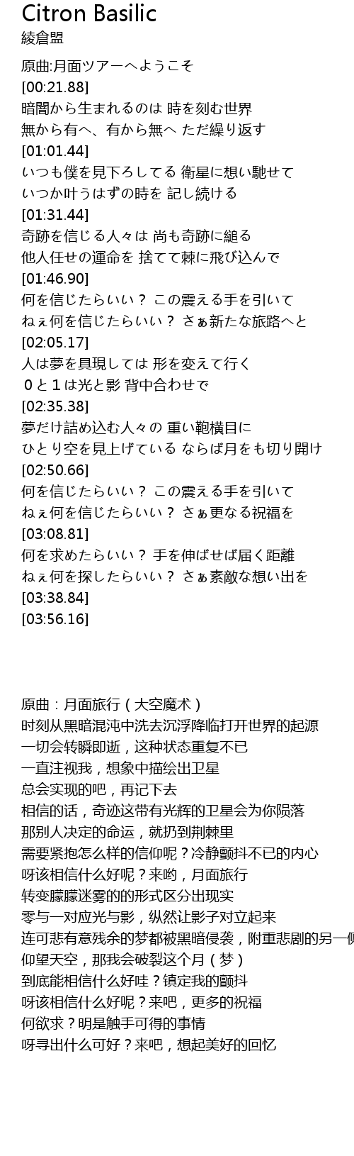 | [00:16.43] | 原曲:月面旅行(大空魔术) |