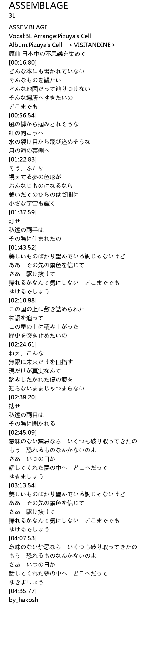 | [00:04.40] | Vocal: 3L Arrange: Pizuya' s Cell |