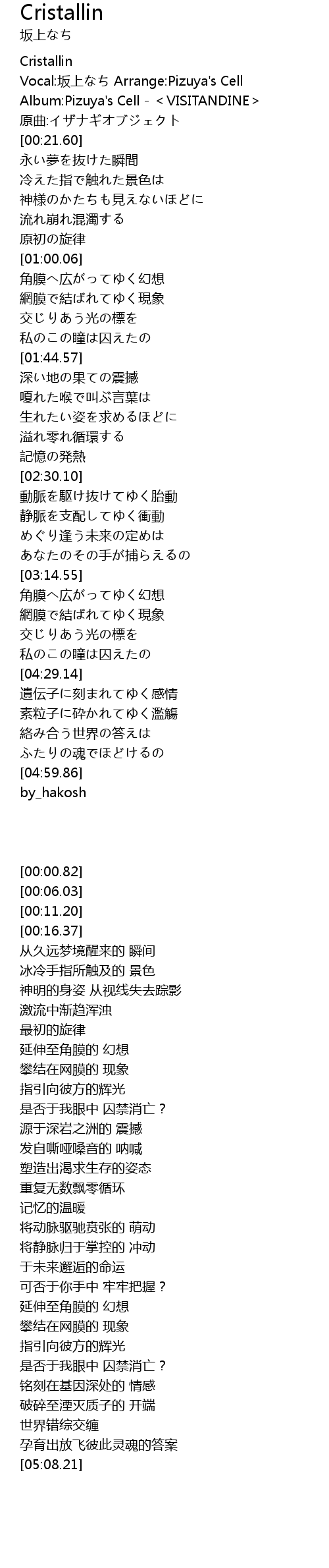 | [00:06.03] | Vocal:坂上なち Arrange:Pizuya's Cell |