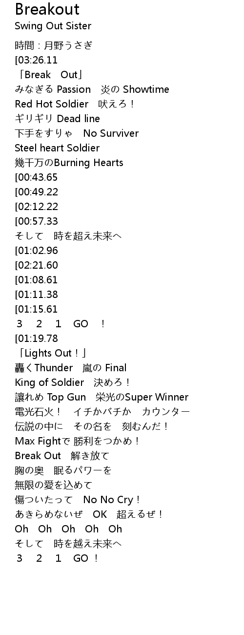 | [03:30.36][00:57.33] | Break Out 突き破れ |