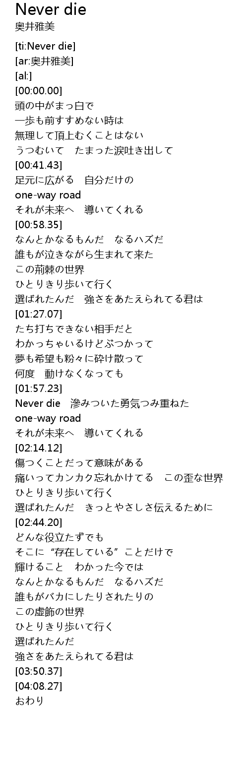 | [01:57.84] | Never die 滲みついた勇気つみ重ねた |