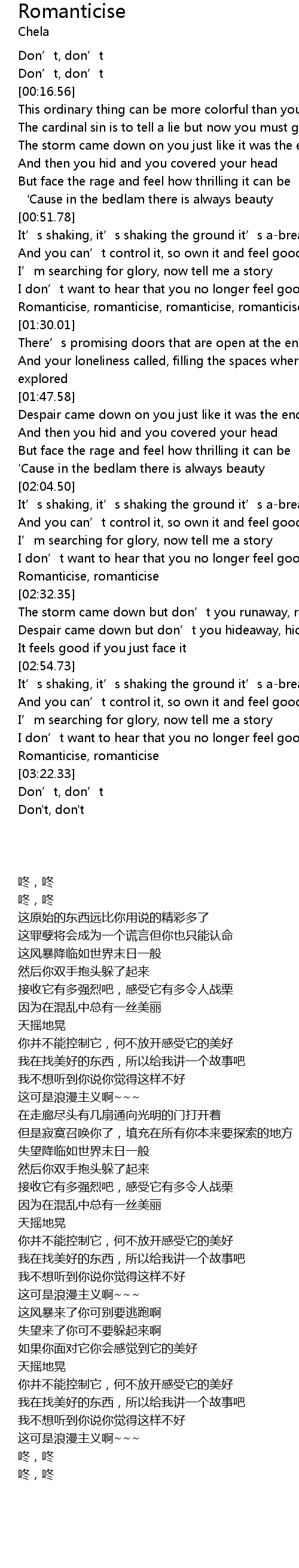 | [01:11.02] | Romanticise, romanticise, romanticise, romanticise |