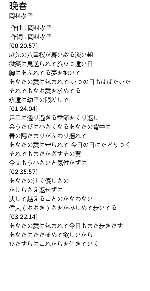 | [00:00.00] | 作曲 : 岡村孝子 |