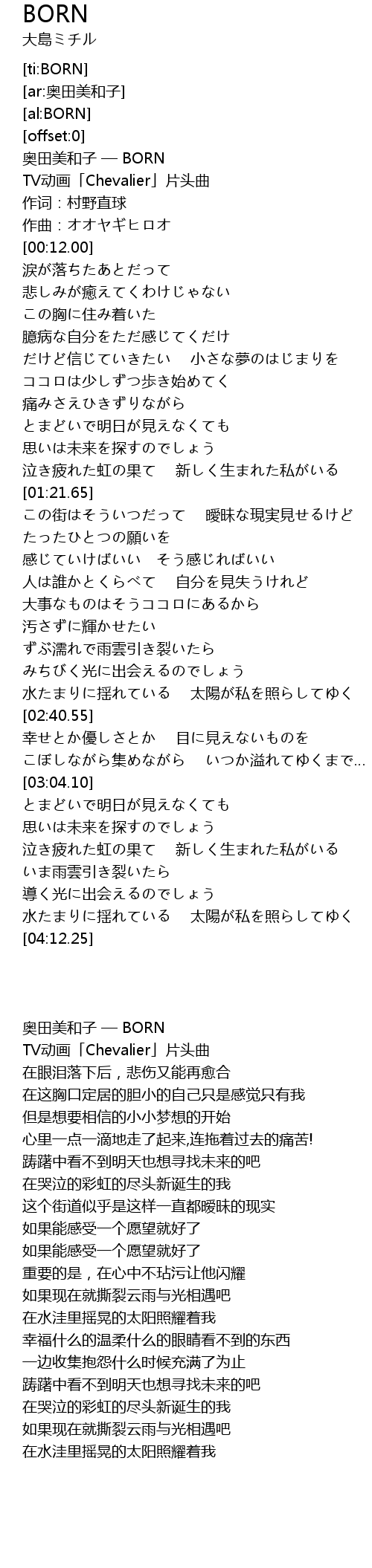 | [03:39.10] | 泣き疲れた虹の果て 新しく生まれた私がいる |