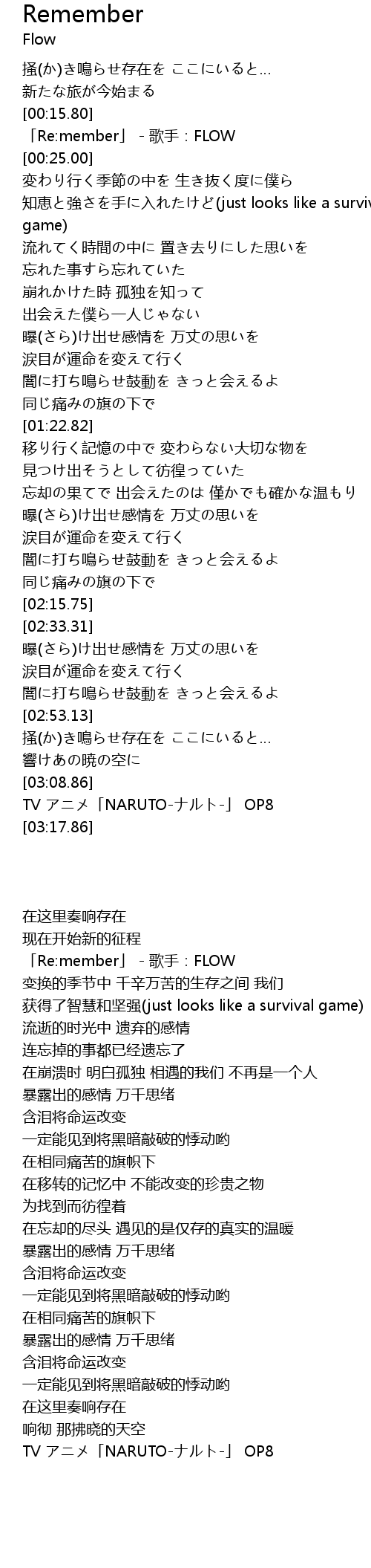| [00:18.00] | 「Re:member」 - 歌手:FLOW |