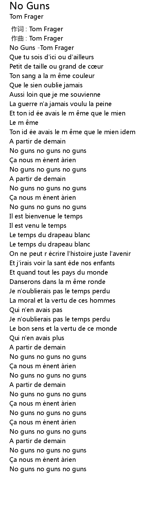 | [00:00.340] | No Guns -Tom Frager |