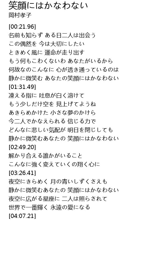 | [02:38.63] | 静かに微笑むあなたの 笑顔にはかなわない |
