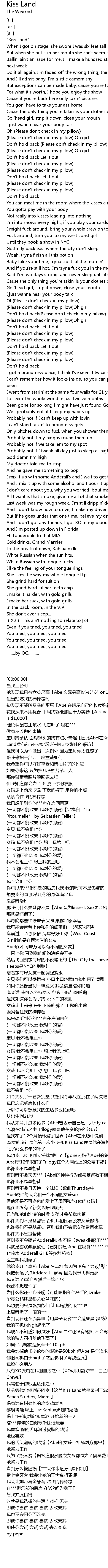 | [05:07.05] | 我就是喜欢飘飘欲仙【已知的是 Abel在吸食*** *** *** 止咳水 Adderall GHB等多种药物】 |