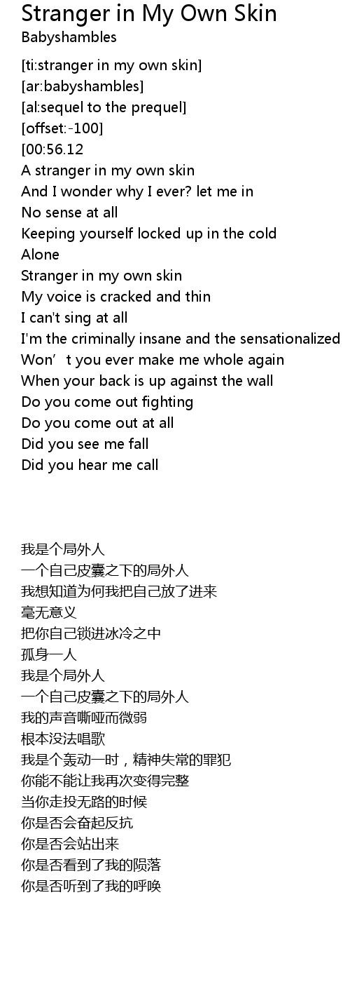 | [00:34.06] | A stranger in my own skin |