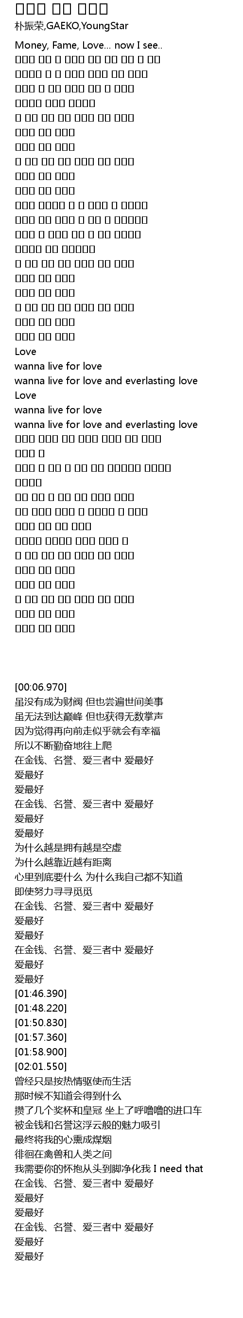 | [00:06.970] | Money, Fame, Love... now I see.. |