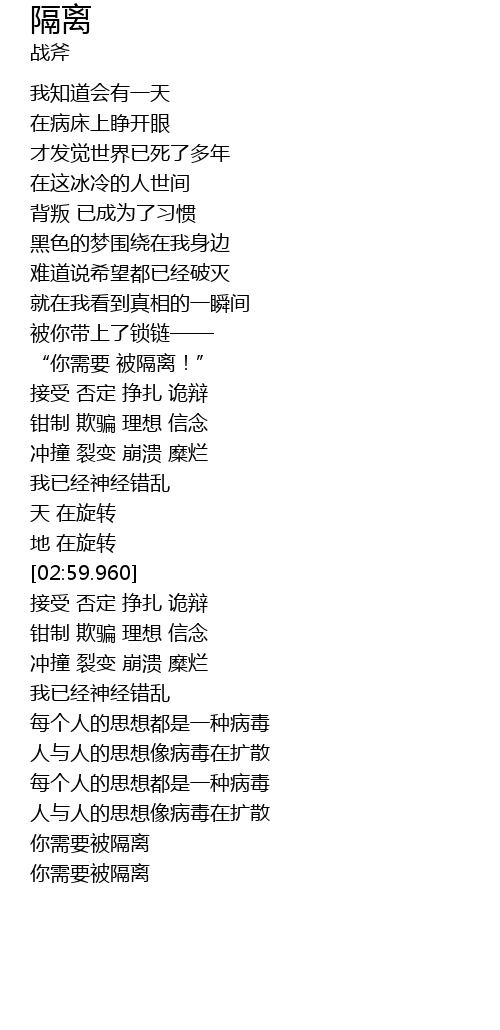 | [03:59.410] | 你需要被隔离 |