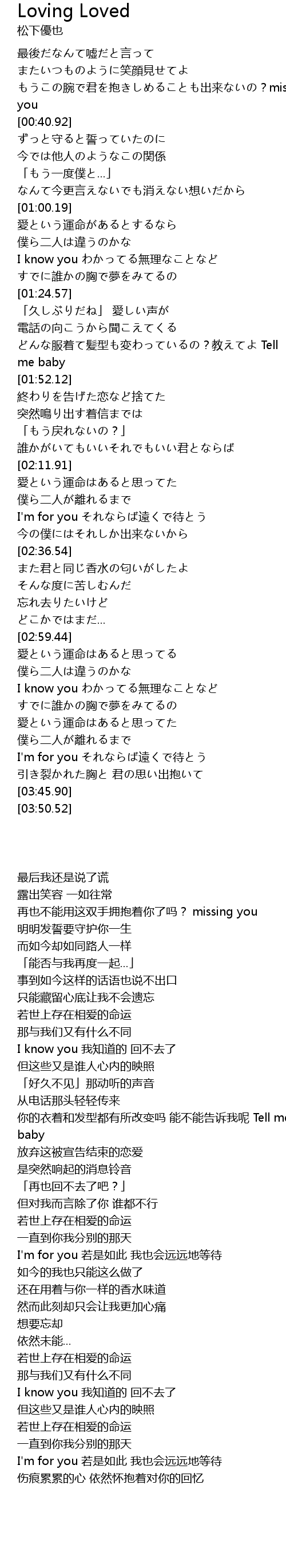 | [00:31.30] | もうこの腕で君を抱きしめることも出来ないの?missing you |