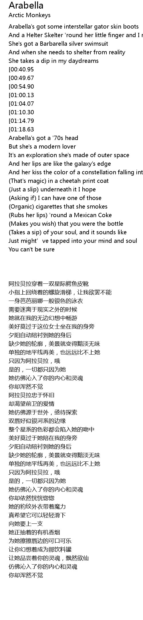 | [00:20.31] | Arabella' s got some interstellar gator skin boots |