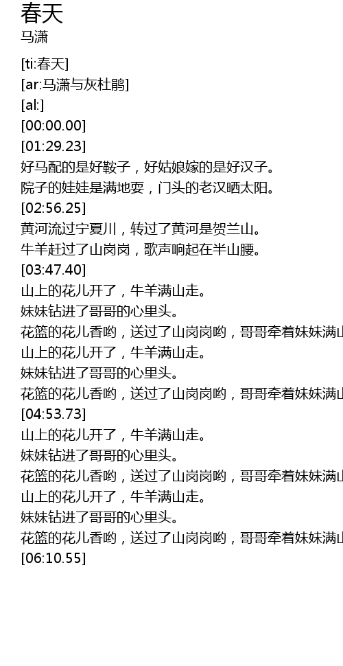 | [04:26.58] | shān shàng de huā ér kāi le, niú yáng mǎn shān zǒu. |
