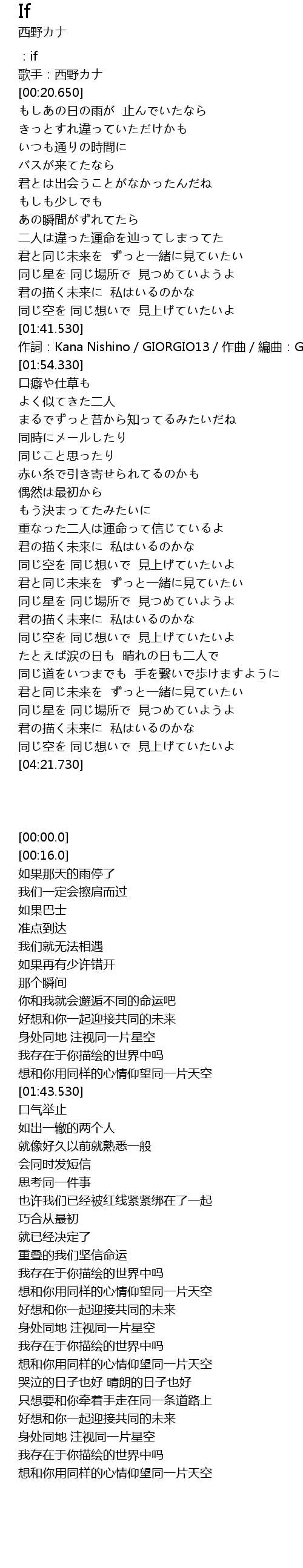 | [03:16.750] | 君の描く未来に 私はいるのかな |