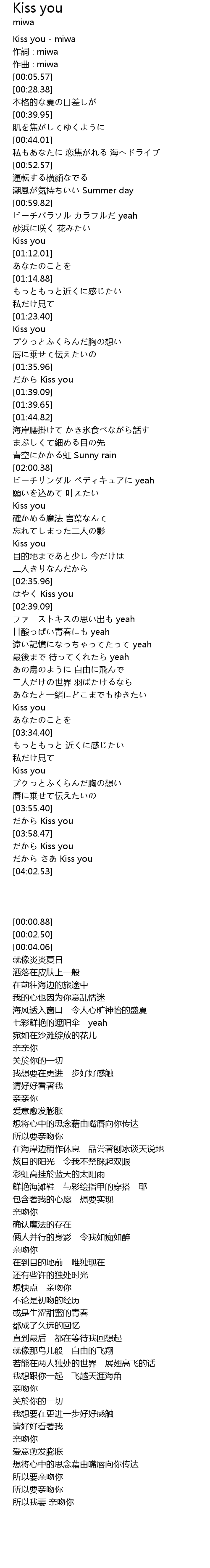 | [00:00.88] | Kiss you miwa |